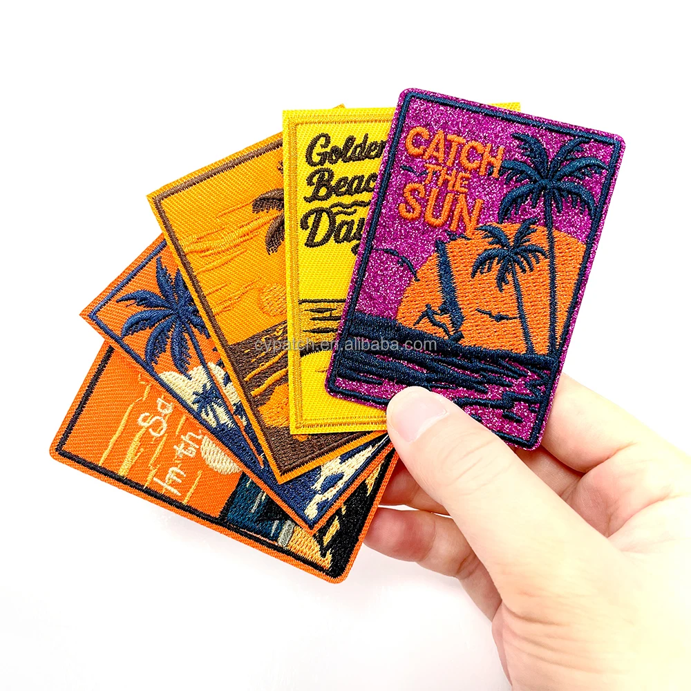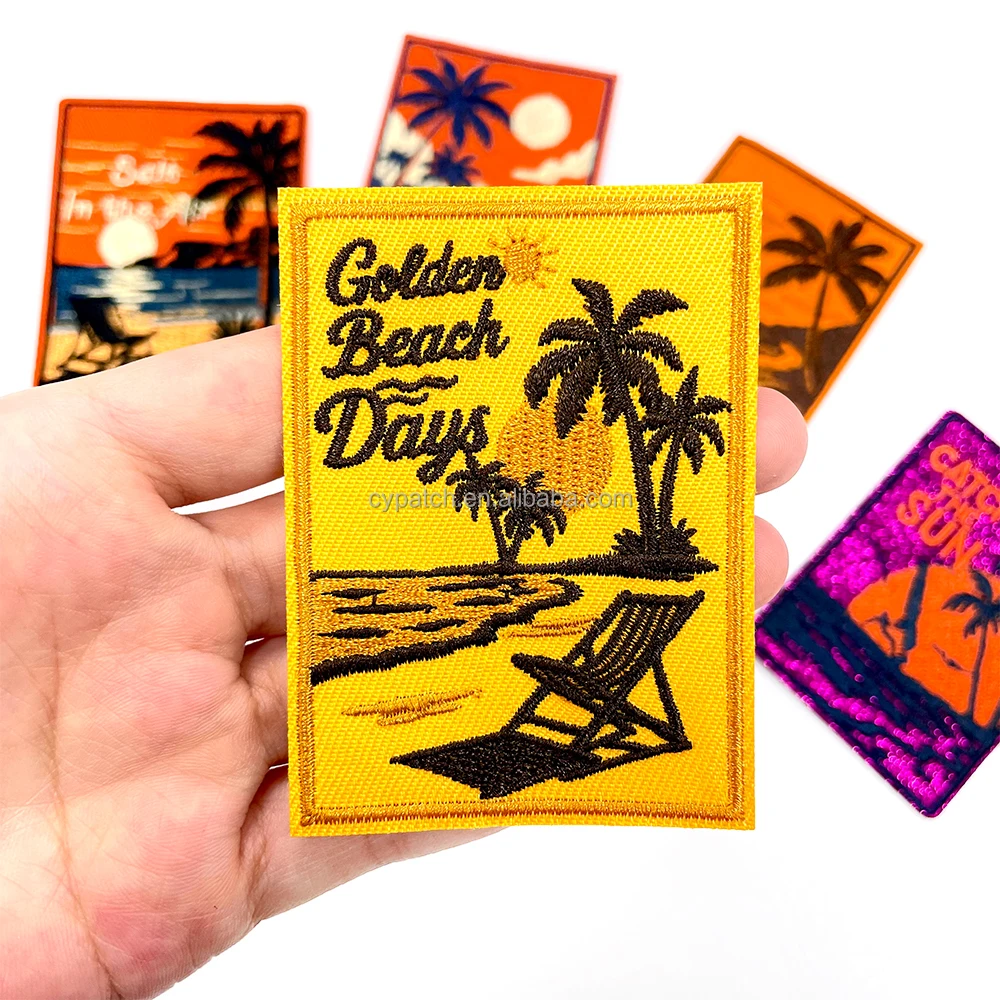 This retro beach sunset embroidery patch set features 5 unique designs with palm trees, ocean waves, sunsets, and vacation vibes. Made from high-quality polyester thread with precise stitching and heat-activated backing, these patches can be easily applied to backpacks, jackets, jeans, shirts, hats, and tote bags. Perfect for DIY travel-themed clothing projects, craft decoration, or souvenirs for beach lovers. Suitable for both sewing and iron-on application, they are ideal for personal use, gift customization, or resort wear branding. Custom designs and bulk orders are welcome.